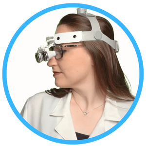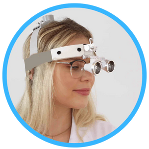 Lentes de vidrio con ampliación de 2.5x o 3.5x y distancia focal de 28 a 38 centímetros. ¡Con las lentes binoculares no necesitas estar tan cerca de tu paciente!