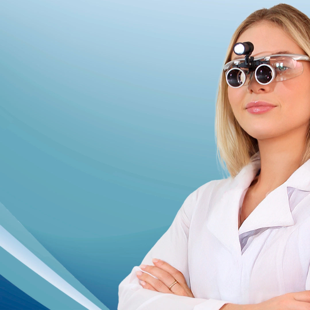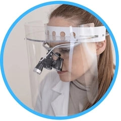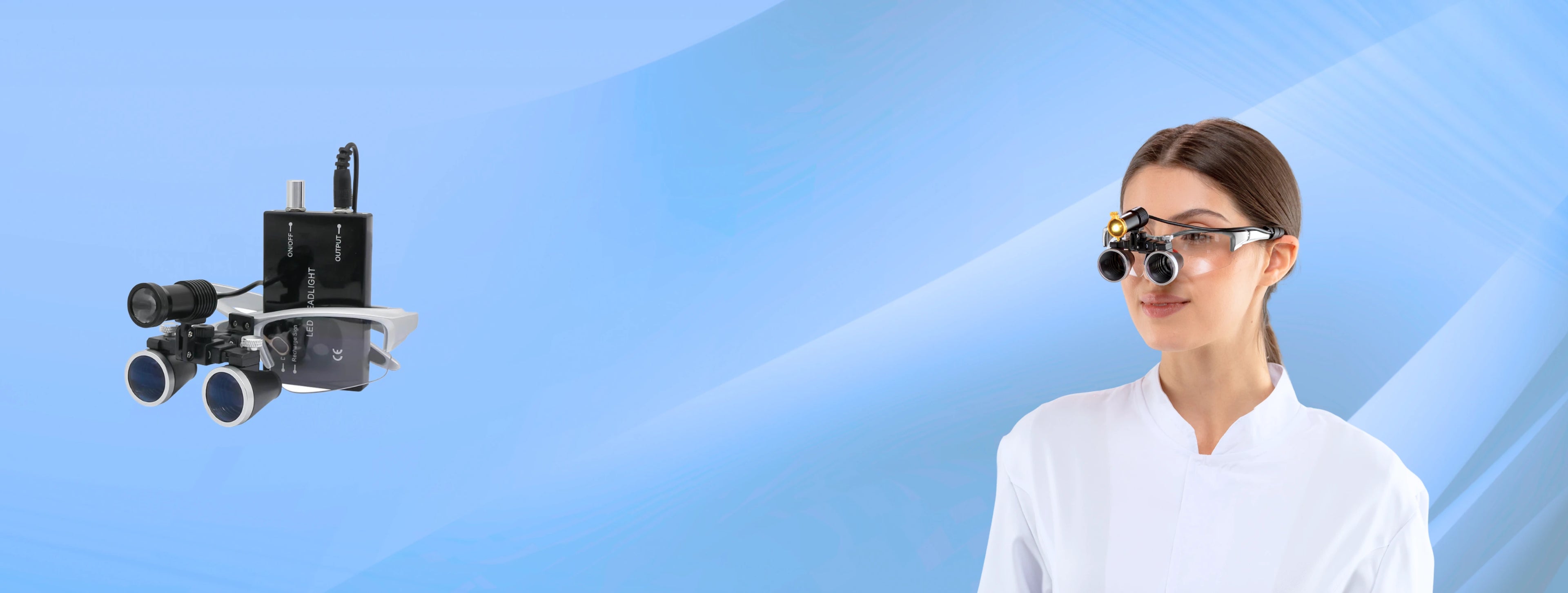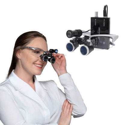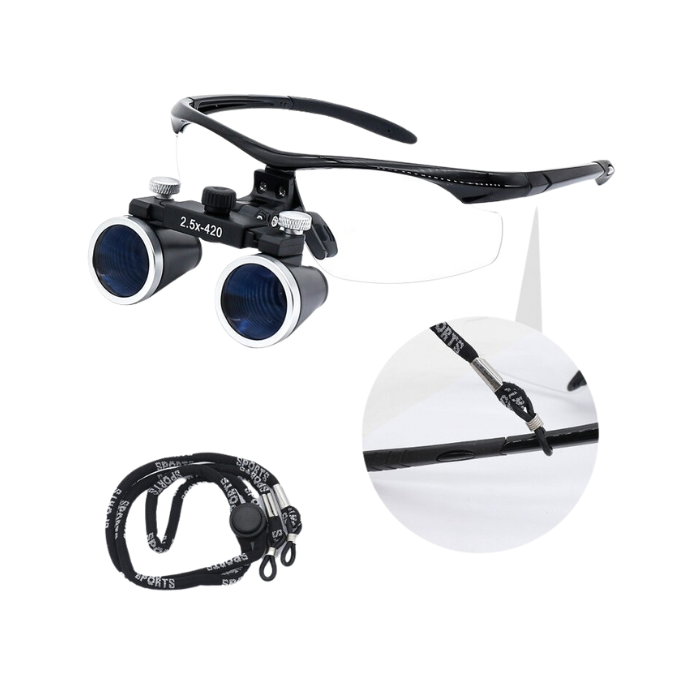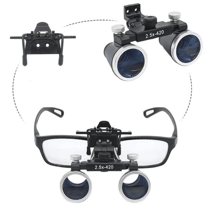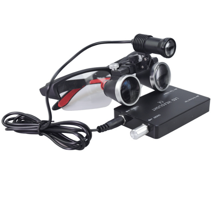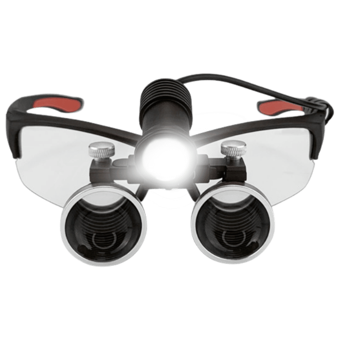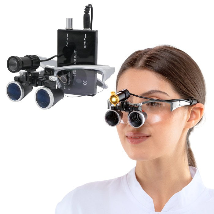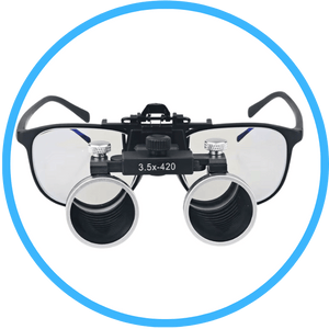Lentes de vidrio con ampliaciones de 2.5x o 3.5x y distancia focal de 30 a 42 centímetros.